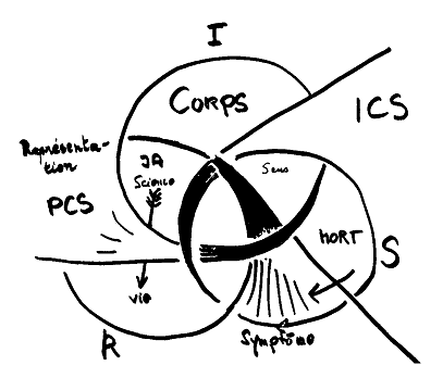 “Nuestro Imaginario, nuestro Simbólico y nuestro Real quizá están para cada uno de nosotros todavía en un estado de suficiente disociación para que sólo el nombre del padre haga nudo borromeo y haga mantener junto todo eso, haga nudo de lo Simbólico, de lo Imaginario y de lo Real” .